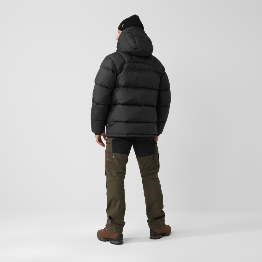 Light version of the classic Expedition Down Jacket from 1974, here with stitch-through construction and 35% less down to suit milder winter climates. The model is also 8 centimetres shorter. Otherwise exactly like the original: generous hood, yellow adjustment cords and spacious pockets. Reinforced with synthetic padding over shoulders to resist moisture and pressure.
