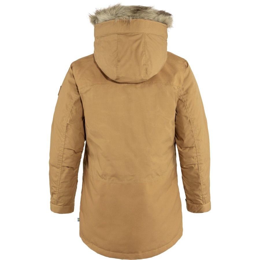 Warm and durable down jacket with a traditional, long cut. A classic, long model in hardwearing G-1000 Eco with extra durable G-1000 HeavyDuty over the shoulders and rear. Perfect for low-intensity winter activities in really cold temperatures. Two large chest pockets with zippers and two top-loading pockets lower down, plus an inside pocket and mesh storage pockets. Drawcords at the waist and hem, and sleeve cuffs that are adjusted with Velcro. This is an updated version of Fjällräven's classic parka, now made with sustainable fabrics and improved features and fit.