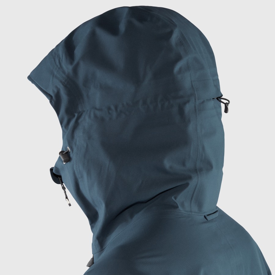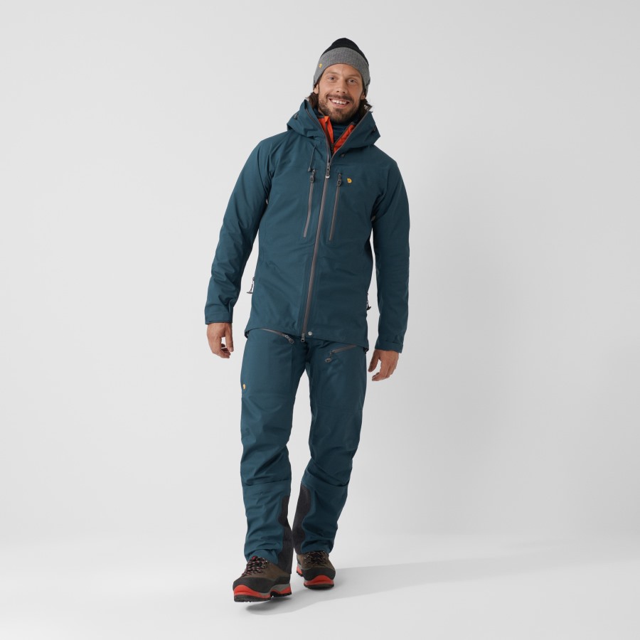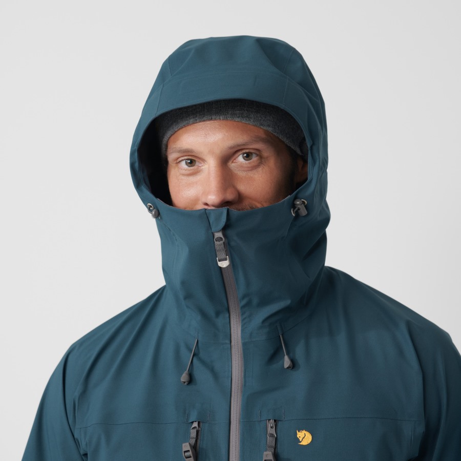 Technical shell jacket for alpine trekking or ski touring. Packable and reliable when the weather turns against you. Durable Eco-Shell fabric gives complete weather protection while being quiet and pliant, making moving about easy. Articulated fit and well-designed details, such as zipper pullers shaped so they are easy to grip while wearing thick gloves. Equipped with RECCO reflectors.