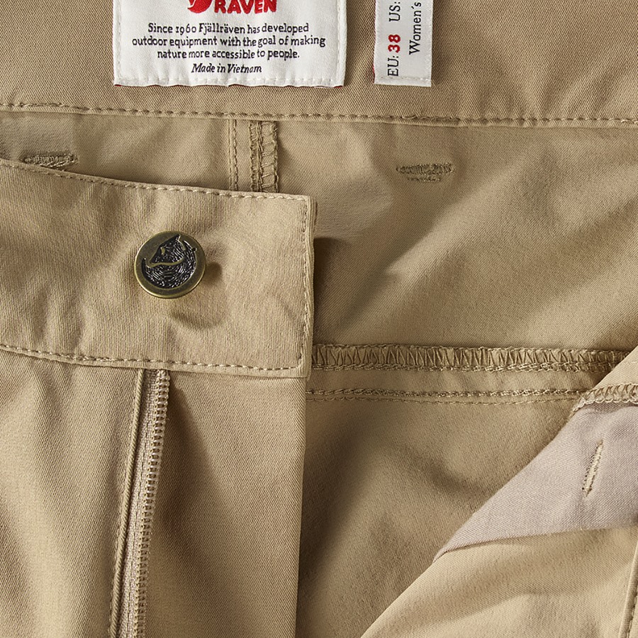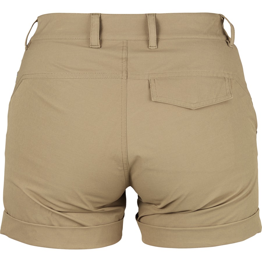 Minimalistic and functional shorts in comfortable stretch fabric. Designed for excellent freedom of movement and comfort on light treks and warm summer days. Two hand pockets and a coin pocket at the waist, as well as a zippered security pocket on the left hip. There is also a back pocket with a buttoned flap and a small loop at the waist for attaching equipment. Well-fitting, feminine cut and leg endings with rolled hems.