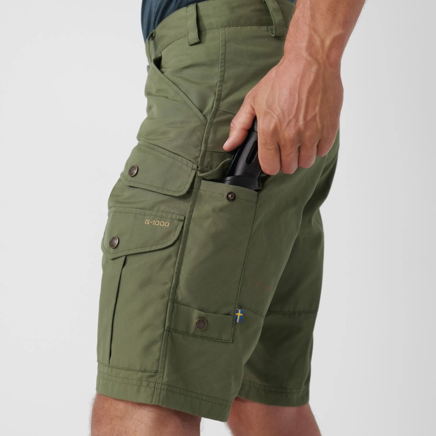 Robust trekking shorts in wind and water resistant G-1000 Original, with double layers of fabric over the rear for extra durability. Practical pockets that have room for everything you want to keep close at hand; two hand pockets, a large map pocket with flap and inside mobile phone pocket on the right leg plus two leg pockets and an axe pocket on the left leg. Mid waist and regular fit.