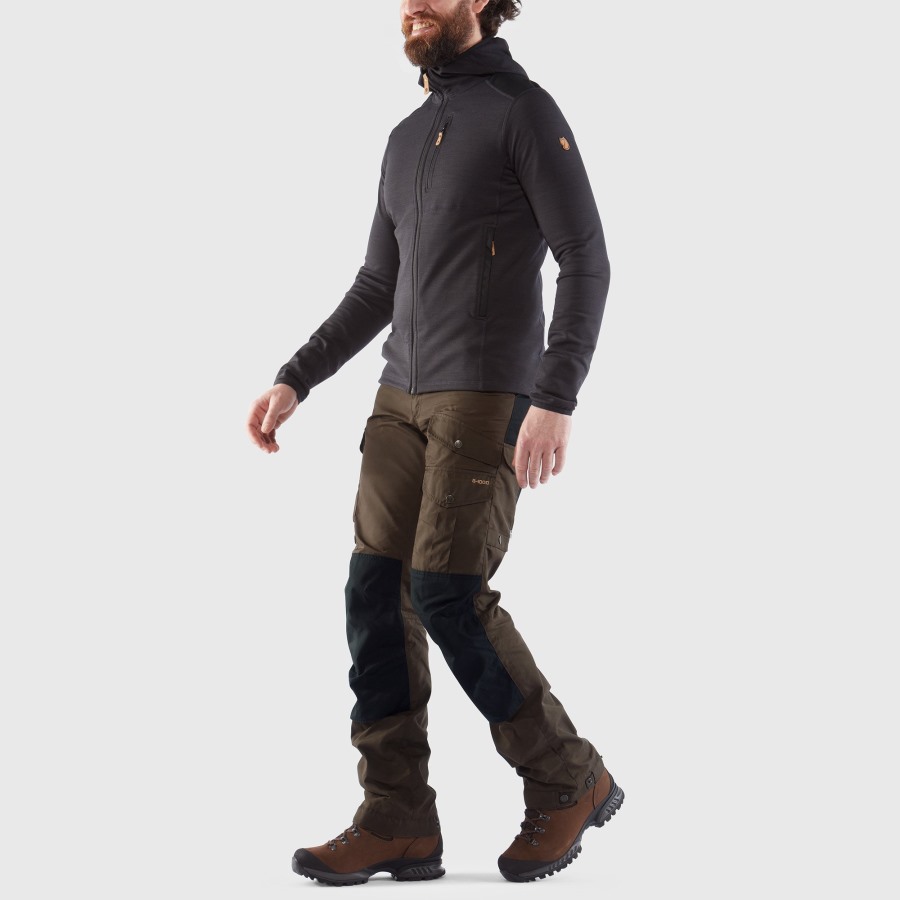 Durable trekking trousers for adventures in the mountains and forest. Made from durable wind and water-resistant G-1000 fabric and reinforced with double layers over the rear and knees. Regular (mid) waist and regular fit with pre-shaped knees that has openings for knee pads (an accessory). Six pockets provide practical storage; two hand pockets, two pockets on the left leg and a large map pocket with an inside mesh phone pocket on the right leg. There is also a practical smaller pocket for a multitool on the side of the left leg. Elastic strap adjustment with press buttons at leg endings. NOTE: this model has a shorter inseam length, 76 cm/30" in all sizes. Also available in regular and long leg length (art no. 81760R and 81760).