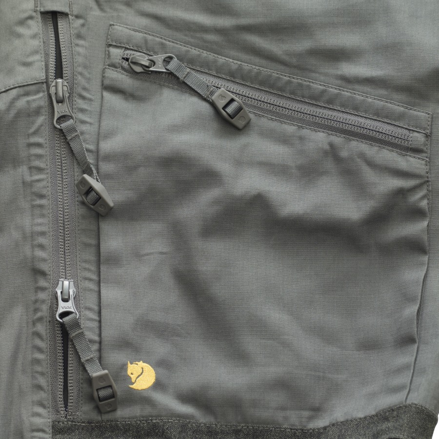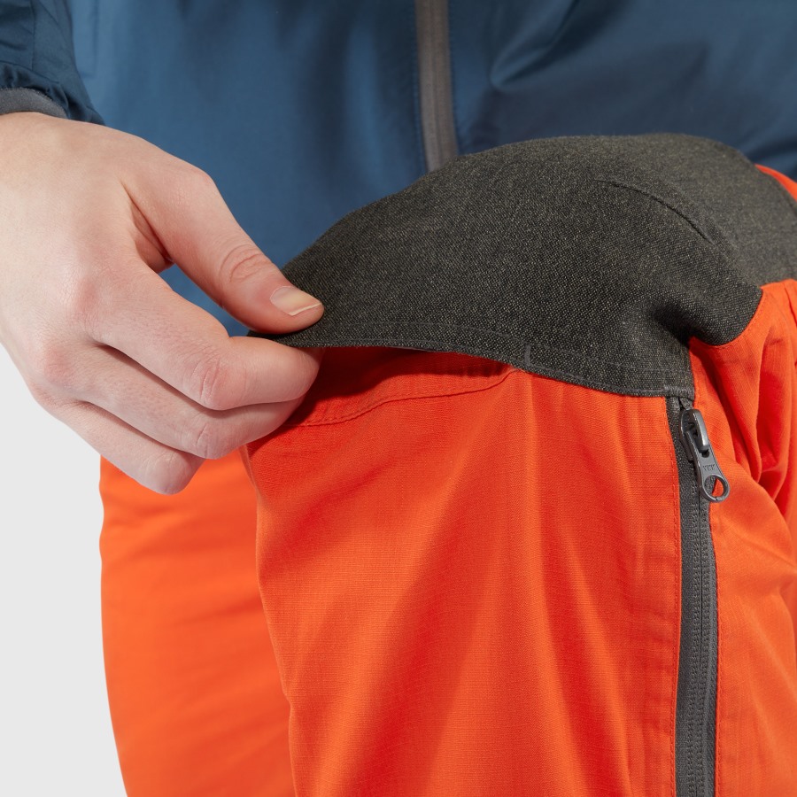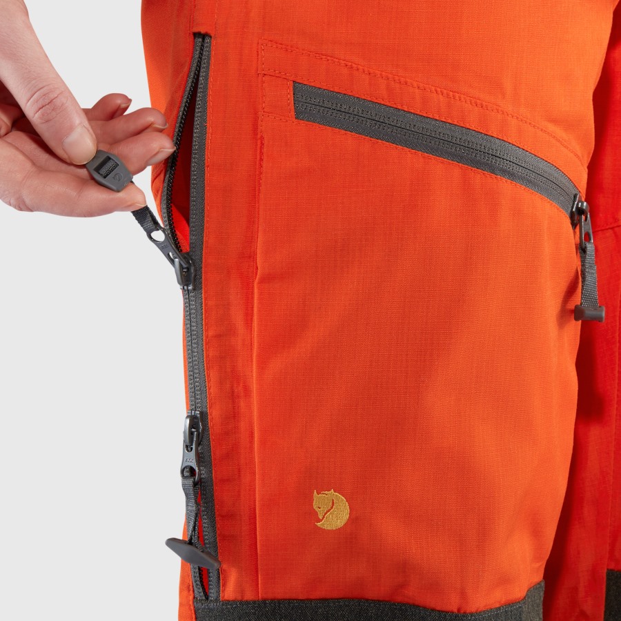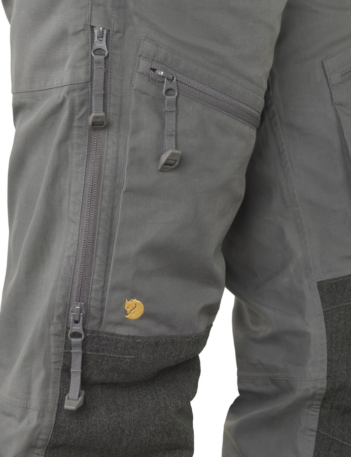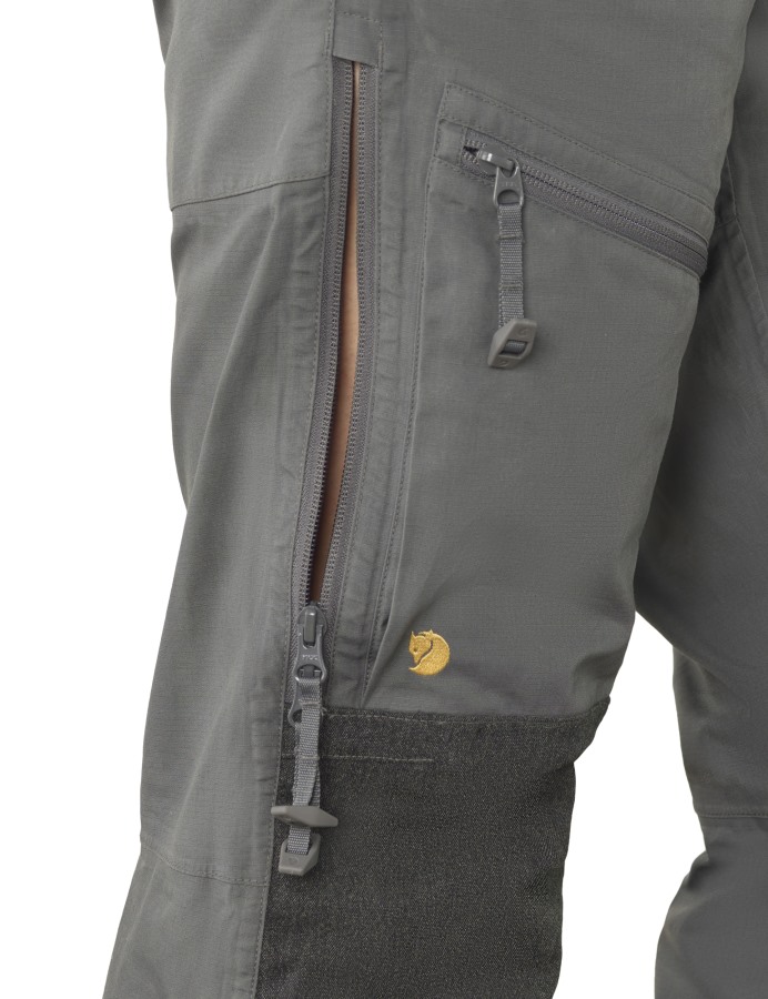 Technical outdoor trousers for unlimited freedom of movement in steep terrain. Light, strong material and innovative taping give trousers that are both durable and pliant. Their excellent breathability makes them perfect for strenuous activities, all year round. Light, strong and water-resistant G-1000 Lite Eco. 65% recycled polyester, 35% organic cotton. Double layers of G-1000 Eco over the rear. Reinforcements in aramid-based Corylon. Technical, articulated cut. Taped seams. Ventilation zippers from the hips to knees. Zippers in the lower sides for easy putting on/taking off. Zippered leg pockets. Two hand pockets. Equipment loop at the waist. Openings for kneepads (an accessory). Adjustment straps at the leg endings. RECCO reflector. Impregnated with Greenland Wax.