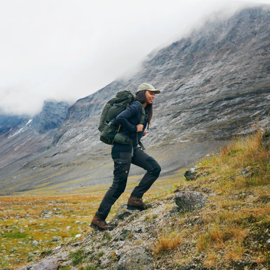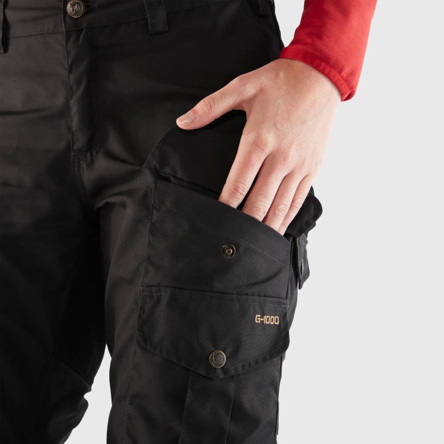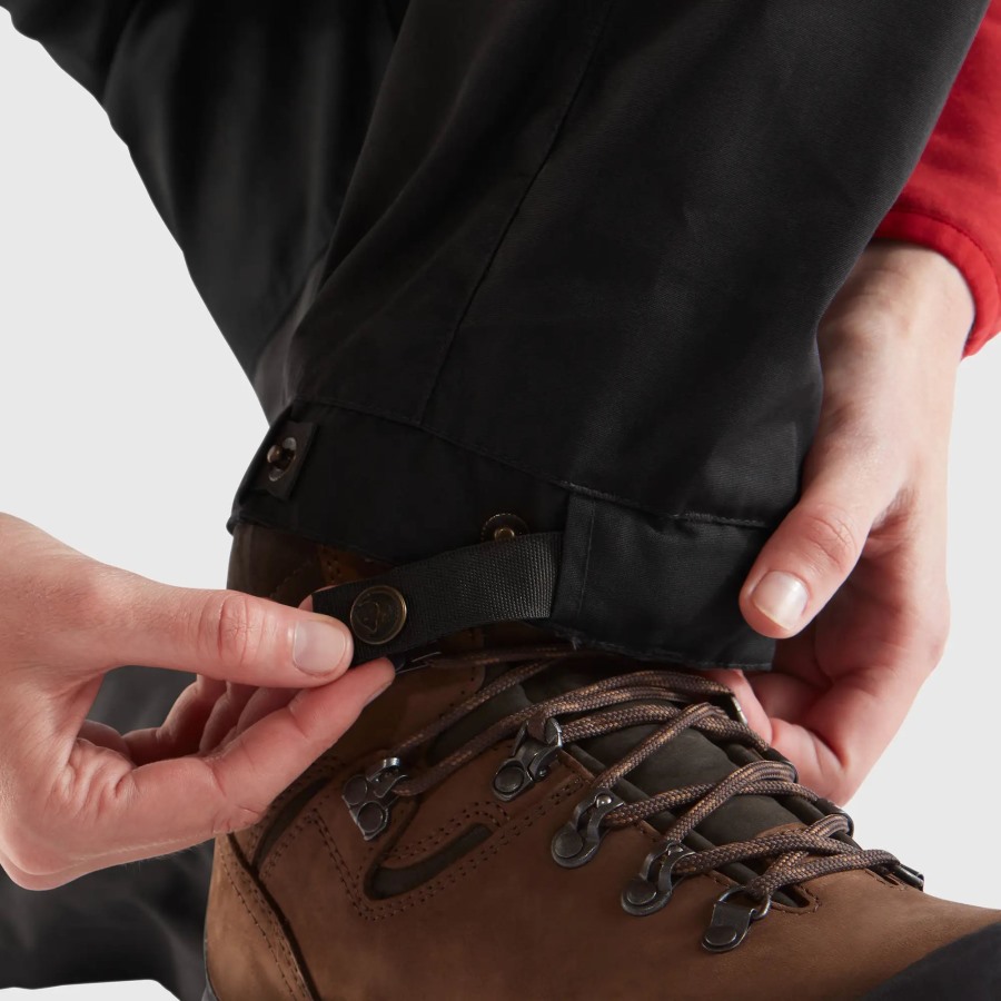 Durable trekking trousers for adventures in the mountains and forest. Made from durable wind and water-resistant G-1000 fabric with double layers over the rear and knees. Regular waist (mid waist) and regular fit with pre-shaped knees. Six practical pockets including a map pocket and an axe pocket. Elastic strap adjustment with press buttons on leg endings. NOTE: this model has regular leg length.